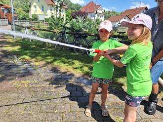 Das Wetter meinte es gut mit uns. Nach einer kurzen Stärkung mit Wasser, Limo und leckeren Muffins durften wir dann erst mit dem Feuerwehrauto aus der Garage fahren und dann noch mit dem Feuerwehrschlauch auf Bäume und Ziele spritzen. Ganz klar – bei der Hitze blieb kein T-Shirt trocken! Wir hatten unheimlich viel Spaß und bedanken uns ganz herzlich für die Einladung!