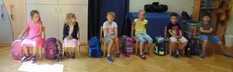 Heute durften alle Vorschulkinder ihren Schulranzen mit in den Kindergarten bringen. In der Turnhalle bauten wir gemeinsam einen Laufsteg auf. Zu fetziger Musik durften wir darüber marschieren - die anderen Kinder klatschten im Takt dazu.