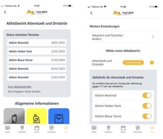 Ab sofort sind die Abfallabfuhrtermine für Restmüll, Gelbe Tonne und Papiertonne in unserer MeinOrtApp hinterlegt.