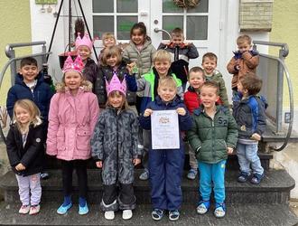 Für das Natur- und Nachhaltigkeitsprojekt wurden die Kinder und das Team beim Ökokids-Programm mit drei Raben geehrt. Der Start erfolgte direkt vor der Haustür: Kräuter sammeln, Gerüche und Materialien kennenlernen, daraus Kräutersalz und Tee herstellen - gemeinsam mit den Eltern wurden die Produkte anschließend auf dem Wochenmarkt in Altenstadt verkauft. Der Wald wurde zusammen mit unserem Förster Herr Karrer erkundet: Tiere, Pflanzen und Lebensräume wurden entdeckt und die Bedeutung des Waldes für Mensch und Tier erläutert. Ein Highlight war der Besuch des Wildwagens, bei dem Tierpräparate und Felle nah erlebt werden konnten. Einen weiteren Einblick erhielten die Kinder auf unserem örtlichen Bauernhof: Hoftiere hautnah und „live“, Fragen stellen und Einblicke in die Arbeit/Verantwortung der Tierhaltung faszinierte uns alle.