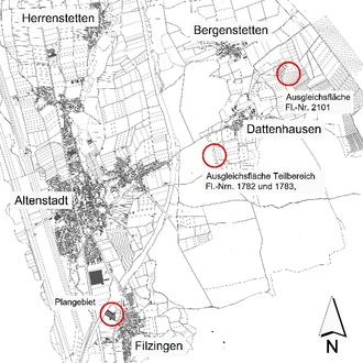 Die Bauleitplanung betrifft die Grundstücke Flur-Nr. 1124/2, 1125/9, 1125/8, 1124/6, 1125/10, 1125/12, 1125/11 vollständig sowie eine Teilfläche des Grundstücks Flur-Nrn. 1123, jeweils Gemarkung Filzingen sowie die Ausgleichsflächen Grundstücke Flur-Nrn. 1782 und 1783 (Teilfläche), Gemarkung Herrenstetten, Markt Altenstadt und Grundstück Flur-Nr. 2101 (Teilfläche), Gemarkung Herrenstetten, Markt Altenstadt.