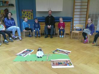 Herr Kleinle erzählte den Kindern die Ostergeschichte rund um Jesus und ging mit den Kindern in den Austausch. Wer war Jesus? Was ist an Ostern passiert? Die Kinder brachten sich mit tollen Gedanken ein.