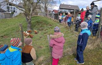 In der vergangenen Woche (17. - 21.03.2025) erlebten die Kinder unseres Kindergartens eine aufregende Woche rund um das Thema Bauernhof. Die Woche begann unter dem Motto „woher kommt das Ei“. Wir schauten bei den Hühnern vorbei und durften sie auch füttern. Davor hatten die Kinder im Kindergarten die Möglichkeit, verschiedenste Eier zu betrachten und viel darüber zu erfahren.