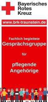Jeden 4. Donnerstag im Monat findet die Angehörigengruppe „Pflegende Angehörige von Menschen mit und ohne Demenz“ von 17:00 – 18:30 Uhr in der BRK-Beratungsstelle, Maximilianstraße 33, Traunstein oder in der BRK-Geschäftsstelle, Gewerbepark Kaserne 13 in Traunstein statt.