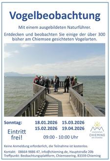 | Sonntag, 18.01.2026 09:00 - 10:00 Uhr | Geführte Vogelbeobachtung in Chieming Mit einem ausgebildeten Naturführer auf der Beobachtungs-Plattform in Chieming. Nehmen Sie Einsicht in die Natur am Chiemsee. Entdecken und beobachten Sie einige der über 300 bisher am Chiemsee gesichteten Vogelarten: Wasservögel mit ihren Küken, Singvögel mit ihren vielfältigen Gesängen, seltene Zugvögel aus fernen Ländern. Lassen Sie den weiten Ausblick auf sich wirken. Kostenlose Teilnahme auch bis 30 Minuten nach Beobachtungsbeginn möglich. Preis: kostenlos Ort: Beobachtungsplattform Chieming, Chiemseering 1, 83339 Chieming |