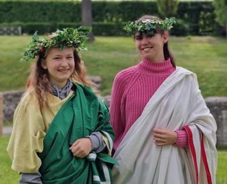 Zwei lorbeerbekränzte Isinger Mädchen auf ihrer Lateinfahrt: Rafaela Schucha als Römerin und Karolin Krieger als Priesterin (rechts)
