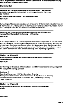 Zum Antrag auf Anbau und Erweiterung der bestehenden Einliegerwohnung auf dem Grund- stück Buchenweg 4 in Chieming wird das gemeindliche Einvernehmen erteilt. Bezüglich der erforderlichen Befreiungen zur Überschreitung der Baugrenze und der Dachform von den Festsetzungen des Bebauungsplanes „Traunschlacht-Wolfsgrube“ wird die Zustimmung er- teilt. Dem Flachdach wird unter der Voraussetzung einer Begrünung zugestimmt.