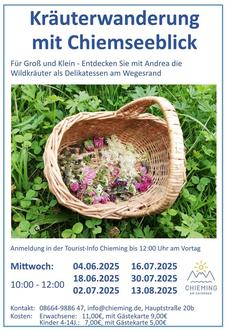 | Mittwoch, 18.06.2025 10:00 - 12:00 Uhr | Kräuterwanderung mit Chiemseeblick in Chieming Für Groß und Klein: Entdecken Sie mit Andrea die Wildkräuter als Delikatessen am Wegesrand und stellen Sie ein leckeres Kräutersalz zum Mitnehmen her. Bitte denken Sie an wettergerechte Kleidung und festes Schuhwerk. Wer möchte bringt einen Sammelkorb und Schreibzeug mit. Hunde bitte zu Hause lassen. Anmeldung in der Tourist-Info Chieming bis 12:00 Uhr vor dem Veranstaltungstag. Tel. 08664-9886 47. Preis: Kinder 4 - 14 Jahre 7€; Erwachsene 11€ (mit Gästekarte Kinder 5€ und Erwachsene 9€) Treffpunkt: 10 Minuten vor Beginn. Ort: Treffpunkt: Tourist-Info Chieming, Hauptstr. 20 b, 83339 Chieming |
