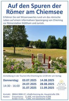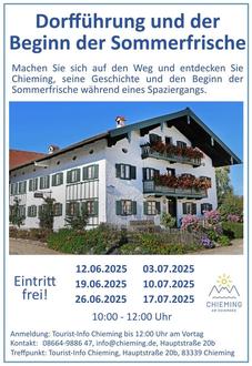 | Donnerstag, 12.06.2025 10:00 - 12:00 Uhr | Chieming entdecken – Dorfführung und der Beginn der Sommerfrische Erleben Sie die Geschichte Chiemings bei einer kostenlosen Führung. Schon die Künstler entdeckten das Land für ihre Kunst als Maler, Literaten und Reiseschriftsteller und legten so den Grundstein für die Sommerfrische in Chieming. Kommen Sie mit auf diese Entdeckungstour in welcher Sie auch in die Historie und die Siedlungsgeschichte Chiemings eintauchen - denn auch während der Römerzeit war in unserer Region schon Einiges geboten! Anmeldung in der Tourist-Info Chieming bis 12:00 Uhr am Vortag. Tel: 08664 9886 47 Ort: Heimathaus Chieming im Gewölbesaal, Hauptstraße 20a, 83339 Chieming |