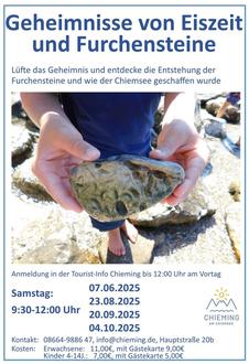 | Samstag, 07.06.2025 09:30 - 12:30 Uhr | Geheimnisse von Eiszeit und Furchensteinen Haben Sie auch schon die Steine am Chiemseeufer entdeckt, welche aussehen wie ein Gehirn und sich gefragt, wie diese skurrilen Steine entstehen? Gemeinsam mit einem ausgebildeten Naturführer erforschen Sie das immer noch nicht komplett gelüftete Geheimnis der Furchensteine am Chieminger Chiemseeufer. Erfahren Sie, wie der Gletscher während der letzten Eiszeit den Chiemsee und sein Umland schuf und seien Sie der alten Uferlinie auf der Spur. Wetterfeste Kleidung und Fernglas, falls vorhanden, bitte mitnehmen. Die Touren finden bei jeder Witterung statt. Anmeldung in der Tourist Information Chieming bis 12:00 Uhr vor dem Veranstaltungstag Tel. 08664-9886 47. Preis: Kinder 4 - 14 Jahre 7€; Erwachsene 11€ (mit Gästekarte Kinder 5€ und Erwachsene 9€) Ort: Minigolfplatz Chieming mit Radverleih, Bei den Bädern 1, 83339 Chieming |