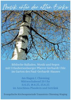 | 20:00 Uhr | Literarisch-Musikalischer Abend - "Die Geschichte von Jona und der schönen Stadt Ninive" (Biblische Ballade von K.-P. Hertzsch) mit Philipp Stauber, Gitarre, Nora Bernitt & Hannah v. Schroeders, Gesang, und Kurpfarrer Gerhardt Uhle - Musik unter der alten Birke im Garten des Paul-Gerhardt-Hauses (bei Regen im P.-G.-Haus), Am Hagen 1, Chieming, |