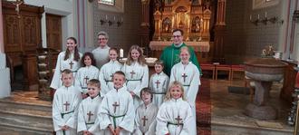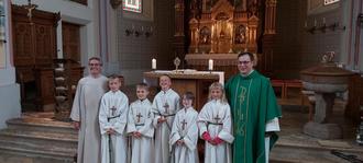 Am Sonntag, den 07. Juli 2024, wurden im Rahmen des feierlichen Gottesdienstes fünf neue Ministranten in die Pfarrgemeinde aufgenommen. Nachdem die Neuen von Zelebrant Pater Gabriel Anton gefragt wurden den Dienst zu übernehmen, antworteten sie kräftig: "wir sind bereit!". Er bedankte sich für die Bereitschaft aller Minis, sowie die Unterstützung der Eltern und betonte wie wichtig die Arbeit der Ministranten sei. Sie seien ein Schmuckstück unserer Kirche und unserer Gemeinschaft. Pastoralreferent Michael Kohl fügte hinzu, dass ihm ein evang. Pastor erzählt hat, dass er die Katholiken um seine Altarhelfer sehr beneide. Nach einem Segensgebet über die neuen Ministranten und die Segnung Kreuze, welche sie bei ihrem Dienst stets tragen, wurden diese feierlich überreicht. Musikalisch mitgestaltet wurde die Messe von der Jugendschola unter der Leitung von Kirchenmusiker Stephan Wahl.