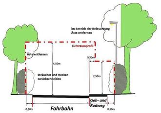 Die Anpflanzungen müssen so weit entfernt werden, dass die Verkehrszeichen, Straßenbeleuchtungen, der Lichtraum entlang und über der Straße bzw. Geh- und Radwegen sowie das Sichtfeld an Einmündungen und Kreuzungen vom angrenzenden Bewuchs freigehalten werden. Die Höhe des erforderlichen Lichtraums bei Geh- und Radwegen beträgt 2,50 m, bei Straßen hingegen 4,50 m. In Sichtdreiecken von Straßenkreuzungen und – einmündungen darf die Bepflanzung eine Höhe von 0,80 m nicht überschreiten. Dank der günstigen Wetterverhältnisse hat sich das Wachstum stark entwickelt und die Anpflanzungen sind deshalb mehrmalig zu überprüfen und gegebenenfalls zurückzuschneiden. Auf das beistehende Schaubild wird hingewiesen.