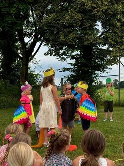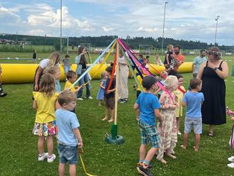Die Kinder hatten sich mit viel Freude und Einsatz auf den Nachmittag vorbereitet. Das Programm begann mit einem Bändertanz, der musikalisch von den Mikälics begleitet wurde. Dieser sorgte für echtes Mittsommer-Flair. Anschließend führten die Kinder ein kleines Theaterstück „Der Streit der Blumen“ auf. Zum Abschluss präsentierten die Kinder noch einen fröhlichen Tanz, der mit viel Applaus belohnt wurde.