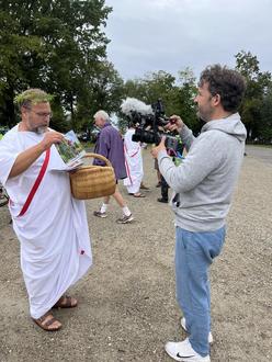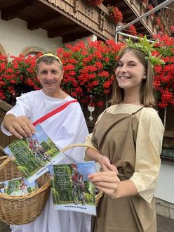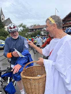 Als die BR Radltour-Teilnehmer dann am 2. August Seebruck für eine bereits vorab geplante Wasserpause auf der „Hafeninsel“ erreichten, wurden sie von hierzu römisch gekleideten HelferInnen empfangen, die eintausend Stück diese Römer-Brillenputztücher an die Radler verteilten und dabei zugleich für Foto-Shootings in ihren Römer-Gewändern bereitstanden.