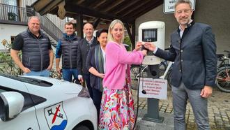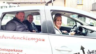 Bürgermeister und Sponsoren beim Start des Chieminger Carsharing – v.r.n.l. Roger Pawellek (Kreissparkasse Traunstein), Nadine Espey (Eltern & Kind-Kliniken Passau), Annegret Obermaier (Klinik Alpenhof Chieming), Stefan Reichelt (Erster Bürgermeister von Chieming), Martin Pauli und Michael Oldenburg (Oldenburg Kunststofftechnik Chieming)