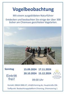 | SONNTAG, 15.09.2024 09:00 UHR | Geführte Vogelbeobachtung in Chieming Mit einem ausgebildeten Naturführer auf der Plattform am Chiemseering entdecken und beobachten Sie einige der über 300 bisher am Chiemsee gesichteten Vogelarten: Wasservögel mit ihren Küken, Singvögel mit ihren vielfältigen Gesängen, seltene Zugvögel aus fernen Ländern. Kostenlose Teilnahme auch bis 30 Minuten nach Beobachtungsbeginn möglich. Ort: Beobachtungsplattform Chieming, Chiemseering 1, Chieming |