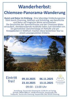 | Donnerstag, 09.10.2025 09:00 - 13:00 Uhr | Chiemgauer Wanderherbst: Chiemsee Panorama Wanderung Kunst und Natur im Einklang - Eine lebendige Entdeckungsreise über 7km und 20 Hm führt Sie durch Chieming, Stöttham und Schützing, wo Kunst, geschichte und Natur auf magische Weise verschmelzen. Die Geschichte der Sommerfrische und der Chiemsee-Maler verzaubert, atemberaubende Ausblicke laden zum Genießen ein und das Kneippbecken in Stöttham sorgt für Erfrischung. Ein gemütlicher Zwischenstopp im Hofcafé und die charmante Begleitung durch die Gästeführer Hubert Steiner und Claudia Lorenz-Berthold machen diese kostenlose Tour zu einem unvergesslichen Erlebnis. Termine: 11.09., 25.09., 09.10., 23.10., 06.11., 13.11.2025 Start: 09:00 Uhr. Dauer ca. 3 Std (+1 Std Einkehr). Anmeldung in der Tourist-Info Chieming: 08664-9886 47 Preis: kostenlos Ort: Treffpunkt: Heimathaus Chieming, Hauptstraße 20b, 83339 Chieming |