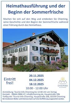 | Donnerstag, 04.12.2025 10:00 - 12:00 Uhr | Chieming entdecken – Heimathausführung und der Beginn der Sommerfrische Die Künstler entdeckten das Land für ihre Kunst als Maler, Literaten und Reiseschriftsteller und gelten somit als Wegbereiter zur Sommerfrische. Mit einem Kurbetrieb und Heilbad beim Gasthof Marienbad beginnt bereits um 1870 die Sommerfrische in Chieming.Im Heimathaus, dem ehemaligen Denglhamger Anwesen, tauchen Sie ein in die Siedlungsgeschichte des Ortes anhand von Funden aus der Bronze-, keltischer- und römischer Zeit zwischen 2.200 vor Christus und 300 nach Christus. Auch werden die eingerichteten Wohn- und Schlafräume besichtigt und Sie erfahren einiges über das frühere Leben und Arbeiten am Bauernhof und im Dorf.Einheimische und Sommergäste sind hierzu herzlich eingeladen. Preis: kostenlos Ort: Heimathaus Chieming - Eingang über Tourist-Info, Hauptstr. 20a, Chieming |