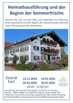 | Donnerstag, 12.12.2024 10:00 - 12:00 Uhr | Chieming entdecken – Heimathausführung und der Beginn der Sommerfrische Erleben Sie die Geschichte Chiemings bei einer kostenlosen Führung. Schon die Künstler entdeckten das Land für ihre Kunst als Maler, Literaten und Reiseschriftsteller und legten so den Grundstein für die Sommerfrische in Chieming. Kommen Sie mit auf diese Entdeckungstour in welcher Sie auch in die Historie und die Siedlungsgeschichte Chiemings eintauchen - denn auch während der Römerzeit war in unserer Region schon Einiges geboten! Bei trockenem Wetter und Interesse kann die Führung im Heimathaus auf eine Dorfführung ausgeweitet werden. Anmeldung in der Tourist-Info Chieming bis 12:00 Uhr am Vortag. Tel: 08664 9886 47 Ort: Heimathaus Chieming - Eingang Tourist-Info, Hauptstr. 20a, Chieming |