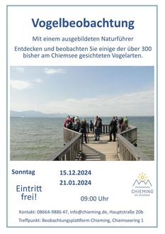 | Sonntag, 15.12.2024 09:00 Uhr | Geführte Vogelbeobachtung in Chieming Mit einem ausgebildeten Naturführer auf der Beobachtungs-Plattform in Chieming. Nehmen Sie Einsicht in die Natur am Chiemsee. Entdecken und beobachten Sie einige der über 300 bisher am Chiemsee gesichteten Vogelarten: Wasservögel mit ihren Küken, Singvögel mit ihren vielfältigen Gesängen, seltene Zugvögel aus fernen Ländern. Lassen Sie den weiten Ausblick auf sich wirken. Kostenlose Teilnahme auch bis 30 Minuten nach Beobachtungsbeginn möglich. Ort: Beobachtungsplattform Chieming, Chiemseering 1, Chieming |