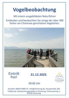 | Sonntag, 21.12.2025 09:00 - 10:00 Uhr | Geführte Vogelbeobachtung in Chieming Mit einem ausgebildeten Naturführer auf der Beobachtungs-Plattform in Chieming. Nehmen Sie Einsicht in die Natur am Chiemsee. Entdecken und beobachten Sie einige der über 300 bisher am Chiemsee gesichteten Vogelarten: Wasservögel mit ihren Küken, Singvögel mit ihren vielfältigen Gesängen, seltene Zugvögel aus fernen Ländern.Lassen Sie den weiten Ausblick auf sich wirken. Kostenlose Teilnahme auch bis 30 Minuten nach Beobachtungsbeginn möglich. Preis: kostenlos Ort: Beobachtungsplattform Chieming, Chiemseering 1, 83339 Chieming |