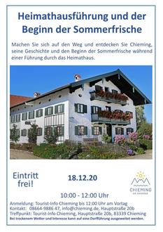 | Donnerstag, 18.12.2025 10:00 - 12:00 Uhr | Chieming entdecken – Heimathausführung und der Beginn der Sommerfrische Erleben Sie die Geschichte Chiemings bei einer kostenlosen Führung. Schon die Künstler entdeckten das Land für ihre Kunst als Maler, Literaten und Reiseschriftsteller und legten so den Grundstein für die Sommerfrische in Chieming. Kommen Sie mit auf diese Entdeckungstour in welcher Sie auch in die Historie und die Siedlungsgeschichte Chiemings eintauchen - denn auch während der Römerzeit war in unserer Region schon Einiges geboten!Bei trockenem Wetter und Interesse kann die Führung im Heimathaus auf eine Dorfführung ausgeweitet werden.Anmeldung in der Tourist-Info Chieming bis 12:00 Uhr am Vortag. Tel: 08664 9886 47 Preis: kostenlos Ort: Heimathaus Chieming - Eingang über Tourist-Info, Hauptstr. 20a, 83339 Chieming |