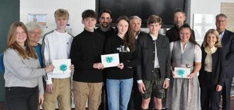 Freuen sich über den Gewinn: Je zwei Schüler vom CHG Traunstein und vom LSH Ising mit Lehrkraft, Versicherer Hubert Berger, zwei Schüler aus Fridolfing, Roger Pawellek von der Kreissparkasse Traunstein-Trostberg, Dr. Birgit Seeholzer von der Chiemgau Wirtschaftsförderung und Kreishandwerksmeister Gerhard Kotter (von links)