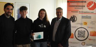 Die Isinger Gymnasiasten Alexander Dobesch und Josepha Mannhardt mit Wirtschaftslehrer Bernhard Rautz (links) und Kreishandwerksmeister Gerhard Kotter