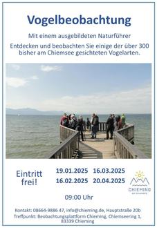 | Sonntag, 18.01.2026 09:00 - 10:00 Uhr | Geführte Vogelbeobachtung in Chieming Mit einem ausgebildeten Naturführer auf der Beobachtungs-Plattform in Chieming. Nehmen Sie Einsicht in die Natur am Chiemsee. Entdecken und beobachten Sie einige der über 300 bisher am Chiemsee gesichteten Vogelarten: Wasservögel mit ihren Küken, Singvögel mit ihren vielfältigen Gesängen, seltene Zugvögel aus fernen Ländern. Lassen Sie den weiten Ausblick auf sich wirken. Kostenlose Teilnahme auch bis 30 Minuten nach Beobachtungsbeginn möglich. Preis: kostenlos Ort: Beobachtungsplattform Chieming, Chiemseering 1, 83339 Chieming |