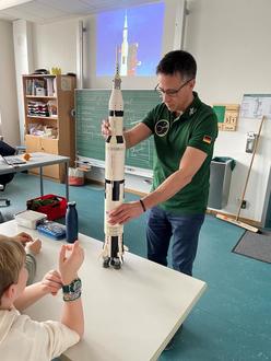 Begeistert folgten die Kinder seinem Vortrag am „Großen Raumfahrttag in Chieming“ und gewannen neue Erkenntnisse und Einblicke zu den Themen: LUNA (der „Mond auf Erden“ – eine Oberflächensimulationshalle in Köln), Galaxien, Sonnensystem, „unendliche Weiten“, Ausflug zum Mond, uvm.