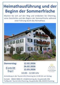 | Donnerstag, 26.02.2026 10:00 - 12:00 Uhr | Chieming entdecken – Heimathausführung und der Beginn der Sommerfrische Erleben Sie die Geschichte Chiemings bei einer kostenlosen Führung. Schon die Künstler entdeckten das Land für ihre Kunst als Maler, Literaten und Reiseschriftsteller und legten so den Grundstein für die Sommerfrische in Chieming. Kommen Sie mit auf diese Entdeckungstour in welcher Sie auch in die Historie und die Siedlungsgeschichte Chiemings eintauchen - denn auch während der Römerzeit war in unserer Region schon Einiges geboten! Bei trockenem Wetter und Interesse kann die Führung im Heimathaus auf eine Dorfführung ausgeweitet werden. Anmeldung in der Tourist-Info Chieming bis 12:00 Uhr am Vortag. Tel: 08664 9886 47 Preis: kostenlos Ort: Heimathaus Chieming - Eingang über Tourist-Info, Hauptstr. 20a, 83339 Chieming |