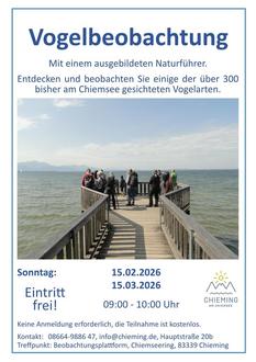 | Sonntag, 15.02.2026 09:00 - 10:00 Uhr | Geführte Vogelbeobachtung in Chieming Mit einem ausgebildeten Naturführer auf der Beobachtungs-Plattform in Chieming. Nehmen Sie Einsicht in die Natur am Chiemsee. Entdecken und beobachten Sie einige der über 300 bisher am Chiemsee gesichteten Vogelarten: Wasservögel mit ihren Küken, Singvögel mit ihren vielfältigen Gesängen, seltene Zugvögel aus fernen Ländern. Lassen Sie den weiten Ausblick auf sich wirken. Kostenlose Teilnahme auch bis 30 Minuten nach Beobachtungsbeginn möglich. Preis: kostenlos Ort: Beobachtungsplattform Chieming, Chiemseering 1, 83339 Chieming |