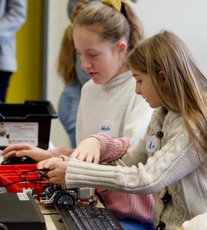 Ihren Lego-Roboter programmieren und bearbeiten konzentriert Antonia Summerer und Anna Künzner vom Isinger Gymnasium (von links), an dem der regionale Robitik-Wettbewerb stattfand