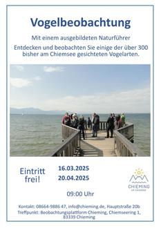 | Sonntag, 16.03.2025 09:00 - 10:00 Uhr | Geführte Vogelbeobachtung in Chieming Mit einem ausgebildeten Naturführer auf der Beobachtungs-Plattform in Chieming. Nehmen Sie Einsicht in die Natur am Chiemsee. Entdecken und beobachten Sie einige der über 300 bisher am Chiemsee gesichteten Vogelarten: Wasservögel mit ihren Küken, Singvögel mit ihren vielfältigen Gesängen, seltene Zugvögel aus fernen Ländern. Lassen Sie den weiten Ausblick auf sich wirken. Kostenlose Teilnahme auch bis 30 Minuten nach Beobachtungsbeginn möglich. Ort: Beobachtungsplattform Chieming, Chiemseering 1, 83339 Chieming |