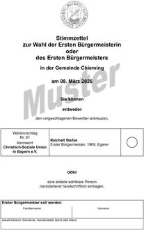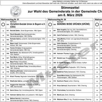 | Die Muster der Stimmzettel für die Wahl der ersten Bürgermeisters oder der ersten Bürgermeisterin sowie für die Wahl des Gemeinderates sind anschließend an diese Bekanntmachung abgedruckt. Der Stimmzettel für die Wahl des Kreistages ist wegen seines Umfanges nicht anschließend abgedruckt. Er liegt während der allgemeinen Dienststunden in der Gemeindeverwaltung zur Einsichtnahme bereit bzw. kann im Vorraum eingesehen werden. | |