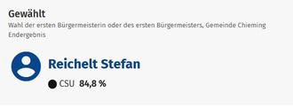 Für die Kreistagswahlen waren es 4.043 Stimmberechtigte, davon haben sich 2.627 Wählerinnen und Wähler beteiligt. Die Wahlbeteiligung lag hier in Chieming bei 65,8 %; dies ist etwas höher als die Wahlbeteiligung im Landkreis (61,2 %)