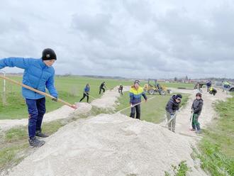 Dann war harte Arbeit angesagt, was aufgrund der niedrigen Temperaturen und teilweisen Schneefällen recht schwer war: Guido verteilte mit dem Minilader 14 t feinen gelben Brechsand auf der Strecke. Unter fachmännischer Anleitung haben die Jugendlichen mit großem Engagement mit Schaufeln, Rechen und Shapern den Sand auf der Strecke verteilt und die Rollhügel und Tabletops neu geformt.