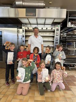 Nach einer kurzen Einführung führte der Weg in die Backstube, wo schon ein leckerer Duft nach frischem Brot und Gebäck in der Luft lag. Mit viel Begeisterung erklärte Helmut den Kindern die wichtigsten Zutaten für das Backen und zeigte ihnen die großen Maschinen, die täglich zum Einsatz kommen und beim Kneten und Formen des Teiges Unterstützung leisten. Der Höhepunkt war die Herstellung von Brezn. Inspiriert vom Bäckermeister konnten die Kinder den frisch vorbereiteten Teig selbst in die Hand nehmen und Brezn, Zöpfe und andere kreative Formen daraus gestalten. Die fertigen Teigstücke kamen dann in den Ofen – die Vorfreude auf das spätere Probieren war groß!