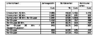 Der Gemeinderat stimmt folgender ab dem Schuljahr 2023/2024 geltender Gebührentabelle unter Berücksichtigung des Kommunalanteils (durchschnittliche Gebührenerhöhung bei der Schülergebühr um 3,90 %) zu.