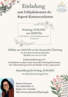 Wir fahren mit einem kleinen Bus, die Buskosten werden von der Gemeinde Chieming übernommen, ebenso gibt es einen Zuschuss zu den Konzertkarten. Der Unkostenbeitrag beträgt daher 15 €. Abfahrt ist um 18:00 Uhr am Rathaus in Chieming.
