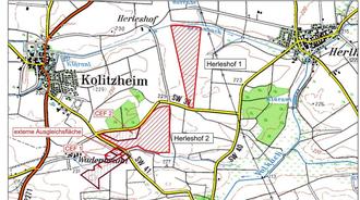 Der Gemeinderat der Gemeinde Kolitzheim hat am 11.01.2022 die Aufstellung des vorhabenbezogenen Bebauungsplans „Solarkraftwerk Herleshof“ sowie die dazu erforderliche Änderung des Flächennutzungsplanes beschlossen. Vorgesehen ist die Errichtung einer Photovoltaik-Freiflächenanlage mit zwei Teilflächen im Bereich zwischen Kolitzheim, Herlheim und Zeilitzheim. Mit der 22. Änderung des Flächennutzungsplanes wird dafür bisherige Fläche für die Landwirtschaft in Sonderbaufläche (mit der Zweckbestimmung „Photovoltaik“) sowie in Flächen für Maßnahmen zum Schutz, zur Pflege und zur Entwicklung von Natur und Landschaft (= Ausgleichsfläche) geändert (s. nachfolgenden Übersichtslageplan).