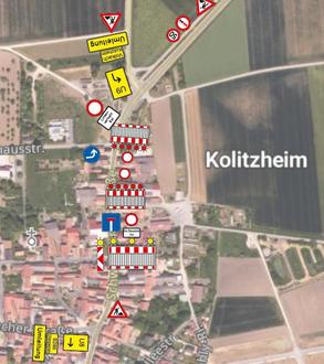Die Umleitungsstrecke erfolgt weiträumig über die Ortschaften Unterspiesheim, Oberspiesheim und Herlheim. Das Rathaus Kolitzheim bleibt über die Rathausstraße (von Norden kommend) bzw. Lindacher Straße (von Süden kommend) weitestgehend anfahrbar.