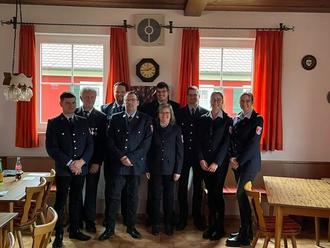 Die neue Vorstandschaft der Freiwilligen Feuerwehr, von links nach rechts, Markus Deffner 1. Vorstand, Jürgen Krauß Kassenprüfer, Alexander Schmidt Beisitzer, Frank Fetzer Beisitzer, Marco Wagner Beisitzer, Franziska Heubeck Beisitzerin, Jürgen Wagner Kassier, Marina Rühl 2. Vorständin, Jasmin Rühl Schriftführerin.