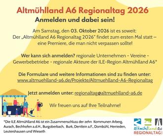 Auch für 2026 ist in der Region einiges geplant. Am 03. Oktober 2026 findet der erste „Altmühlland A6 Regionaltag 2026“ statt. Dieser soll über eine reine Gewerbeschau hinaus gehen und die ganze Angebotsvielfalt der Region sichtbar machen. Regionale Unternehmen haben die Möglichkeit, sich als potenzielle Arbeitgeber und Ausbildungsbetriebe zu präsentieren, Direktvermarkter und Vereine können über ihr Angebot informieren. Zusätzlich ist ein buntes Rahmenprogramm mit Unterhaltung, Essen und Getränken für Groß und Klein vorgesehen.