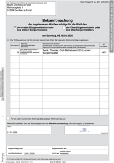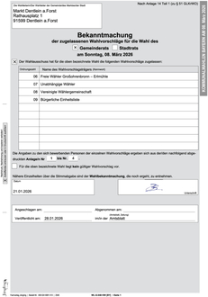 Die Anlagen zu den Bekanntmachungen der zugelassenen Wahlvorschläge werden ortsüblich ausgehängt.