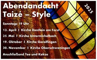 | 19 Uhr | Taizé-Andacht, anschl. Kekse und Tee |