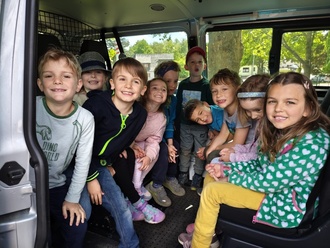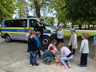 Ein besonderes Highlight war der Polizeibus. Voller Begeisterung stellten die Kinder Fragen und schauten sich alles ganz genau an. Zum Schluss durften sie noch darinsitzen und natürlich sollte auch das Ausprobieren des Blaulichtes und der Sirene nicht fehlen.