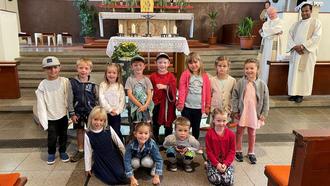 Anlässlich der 90- Jahrfeier und des Abschlusses der Renovierung wurden die Schul- und Kindergartenkinder zu einem Gottesdienst eingeladen. Pfarrer Matejczuk und Pfarrer JoJo gestalteten für die Kinder einen Gottesdienst mit vielen Liedern, der Geschichte vom Engel Raphael und einer Malaktion. Alle Kinder hatten Spaß und freuten sich, dass sie mit dem großen Schulbus fahren durften. Vielen Dank an alle, die zu dieser Aktion beigetragen haben.