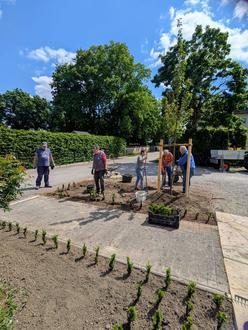 im Einsatz (Bild), um die Beete von alten Wurzeln zu befreien und für die Neuanpflanzung vorzubereiten. Inzwischen sind alle Setzlinge in die Erde gebracht und müssen nun noch anwachsen. Damit dies gelingt, übernehmen die Mitglieder des Obst- und Gartenbauvereins auch das Gießen der Pflanzen.